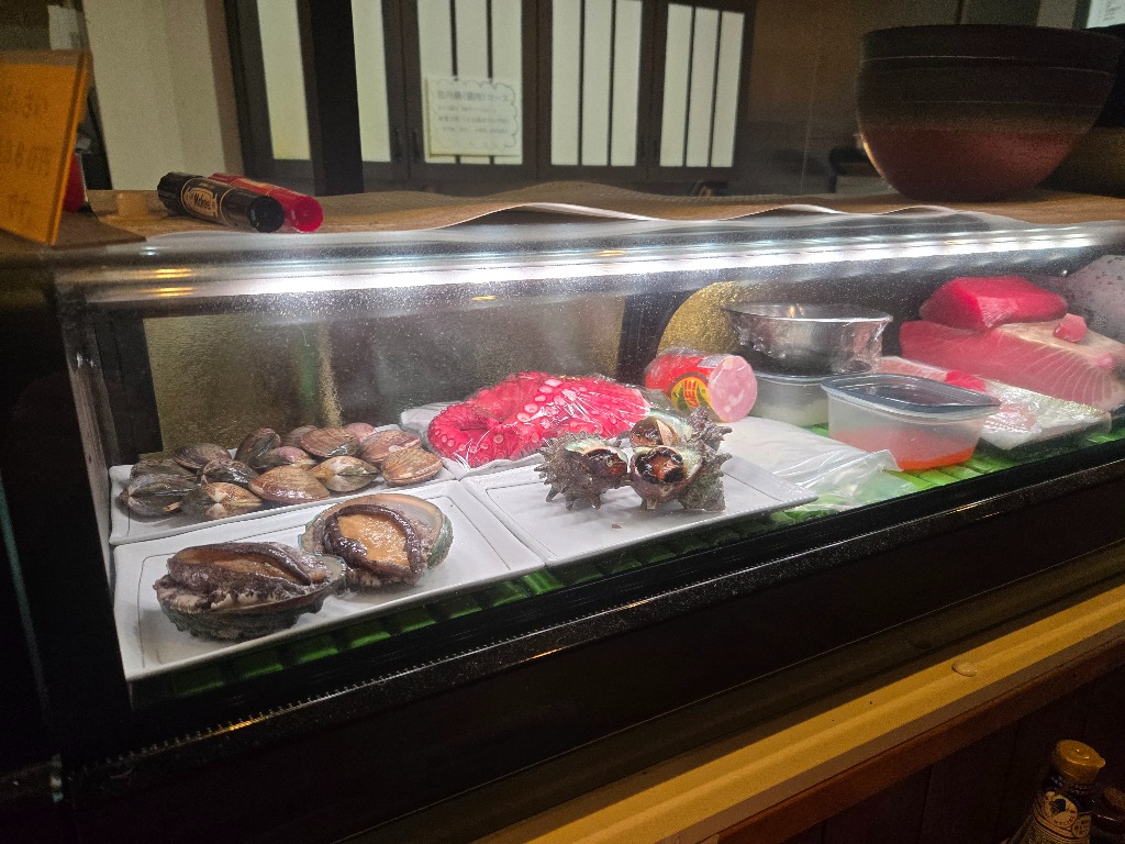 新春明けましておめでとうございます、本日のネタケースの紹介です、お刺身は本マグロ、シマアジ、ヒラメ、真鯛、真だこ、アワビです、サザエはつぼ焼き、蛤は酒蒸しにします、どれも新鮮で美味しくオススメです、グループの方1人飲みの方にもぜひ味わって頂きたい面々です。