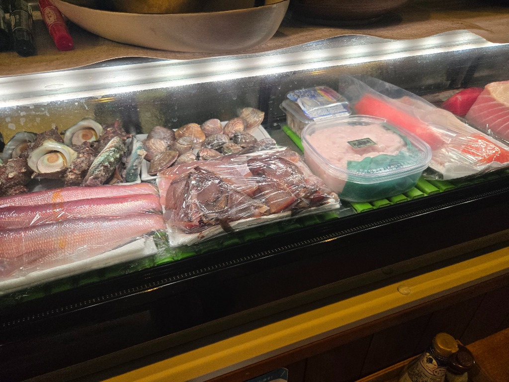 本巣市居酒屋本日のネタケースです、お刺身は本マグロ、シマアジ、真鯛、ヒラメ、サーモン、真だこ、アワビです、久しぶりの白子生、焼、天ぷらに、カレイ唐揚げ、サザエつぼ焼き、蛤酒蒸し、甘鯛松笠焼にします、どれも新鮮で美味しくオススメです、グループの方、1人飲みの方にもぜひ味わって頂きたい面々です。