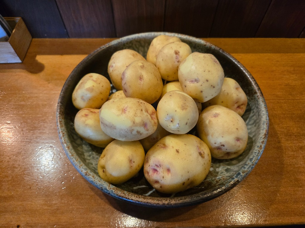 本巣市居酒屋本日紹介は自家栽培のじゃがいもキタアカリです、ポテトサラダ、ポテトフライ、ポテトチップス、バター焼きにしますホクホクで甘みがあり美味しくオススメです、取れたての味を味わうのは今が旬に限ります、グループの方、1人飲みの方にもぜひ味わって頂きたい1品です。