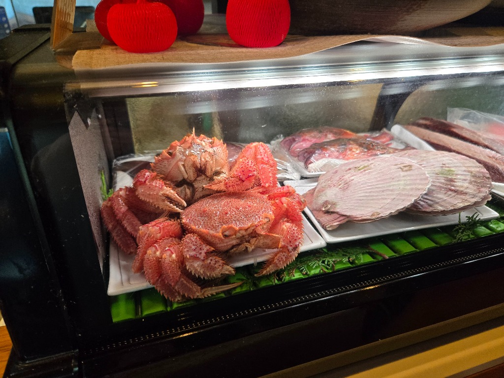 本巣市居酒屋本日入荷の魚たちです、毛ガニ、から付きホタテ、カサゴ、です、毛ガニは塩ゆでホタテはバター焼き、カサゴは煮付け、塩焼きにしますどれも新鮮で美味しくオススメです、グループの方、1人飲みの方にもぜひ味わって頂きたい面々です。