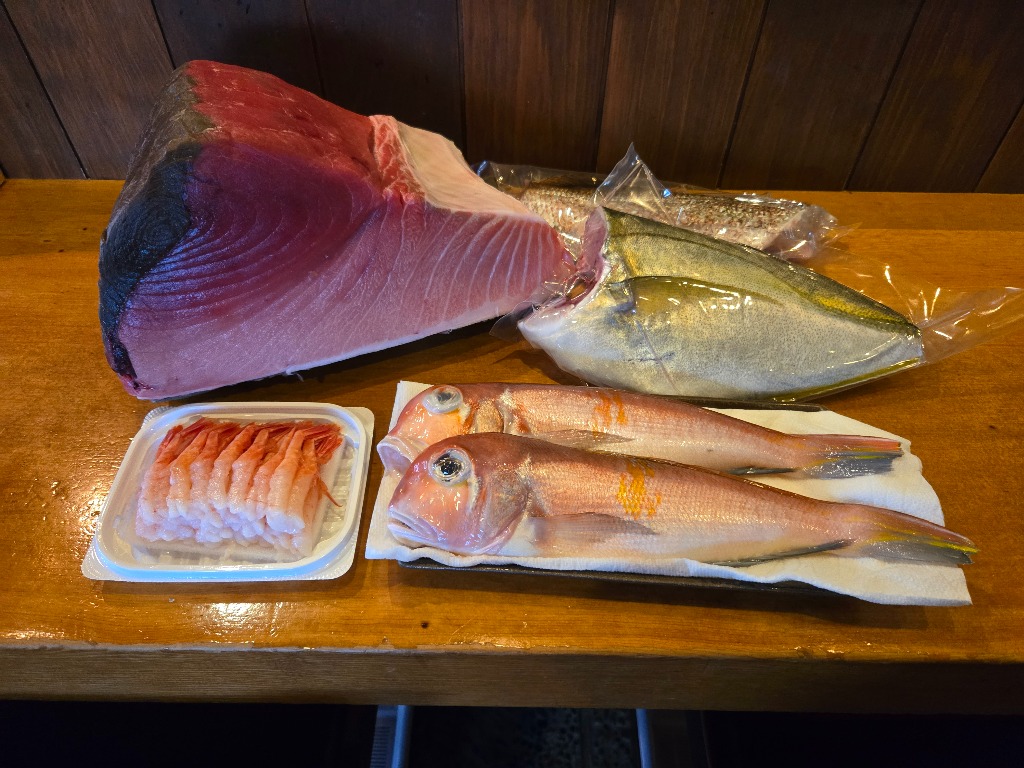 本巣市居酒屋本日入荷の魚たちです、本マグロ、甘エビ、シマアジ、真鯛はお刺身に、甘鯛は松笠焼きにしますどれも新鮮で美味しくオススメです、グループの方、1人飲みの方にもぜひ味わって頂きたい面々です。