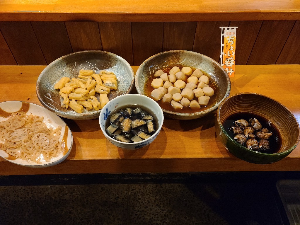 本巣市居酒屋本日紹介はおばんざいの面々です、里芋の煮付け、太刀魚立った揚げ、蓮根のきんぴら、なす揚げ浸し、バイがい煮付けです、一品380円にて提供です、お酒のお供に美味しくオススメです、その他ちょい飲みセット1.380円ドリンク一杯+お刺身二品+おばんざいの中から二品とお得なセットも、グループの方、1人飲みの方にも是非お試し頂きたい商品です。