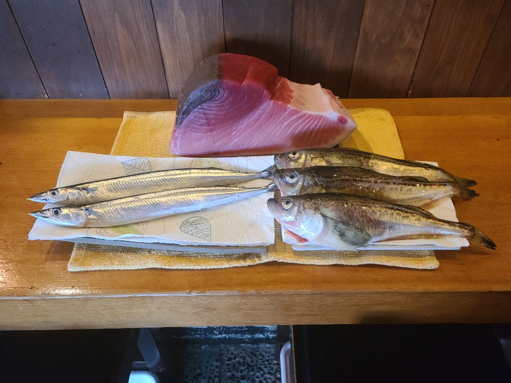 本巣市居酒屋本日紹介は今日仕入れの魚たちです、新鮮サンマ、お刺身、塩焼きに、特大ハタハタ、平均280g巨大で卵又は白子バリバリ塩焼きに、当店定番本マグロはらみ大トロ、中トロ、赤身どれも美味しくオススメです、グループの方、1人飲みの方にも是非味わって頂きたい面々です。