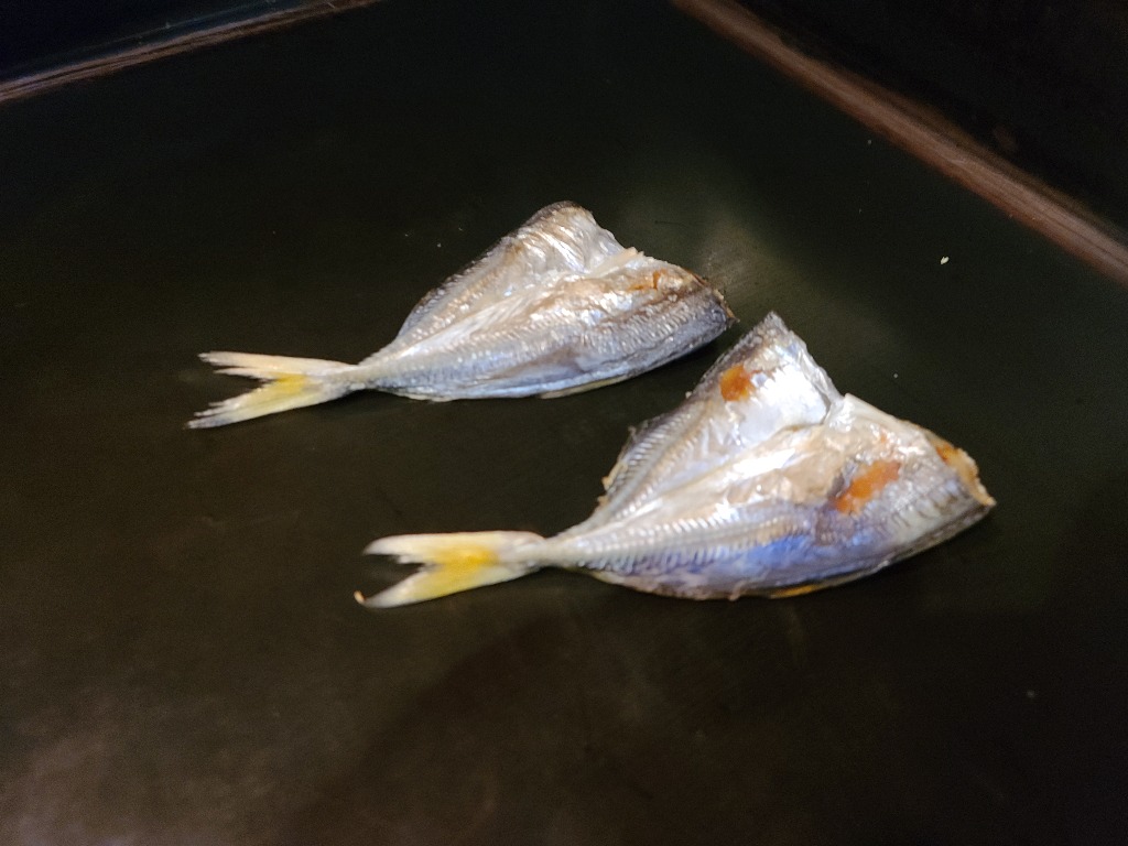 本巣市居酒屋本日紹介はおばんざいの一品マメアジ一夜干しです、手作りです、一人前二枚鉄板にて炙り提供します、おばんざい価格380円で提供又ちょい飲みセットの一品としてもいかがでしょうか、お酒のお供に美味しくオススメです、1人飲み、グループの方にも是非味わって頂きたい商品です。