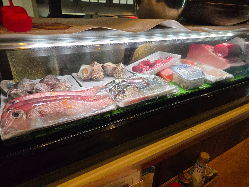 新春明けましておめでとうございます、本日のネタケースの紹介です、お刺身は本マグロ、シマアジ、ヒラメ、真鯛、真だこ、アワビです、サザエはつぼ焼き、蛤は酒蒸しにします、どれも新鮮で美味しくオススメです、グループの方1人飲みの方にもぜひ味わって頂きたい面々です。