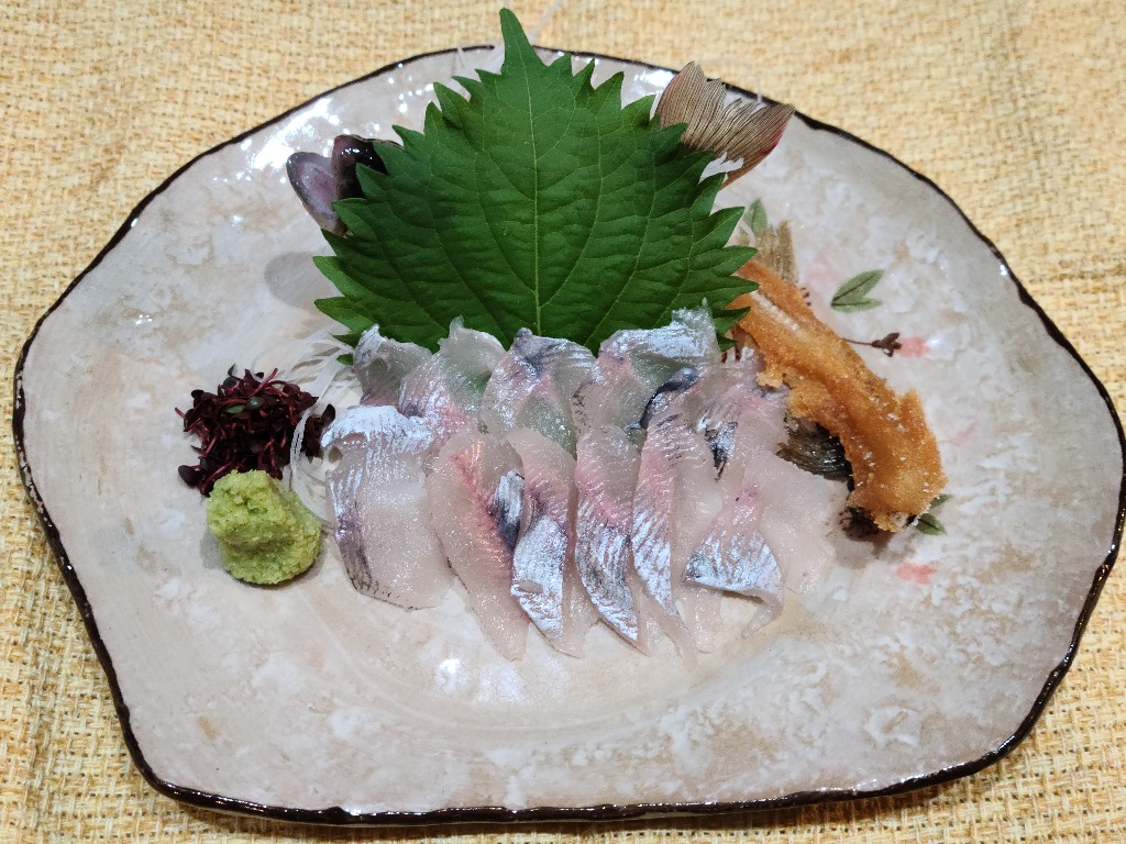 本巣市居酒屋本日紹介は岩魚お造りです、井戸水で活かしてお客様の顔を見てから卸し提供させて頂きます、新鮮で美味しくオススメです、横に添えているのは骨せんべいにしてます、グループの方、1人飲みの方にも是非お試し頂きたい一品です。