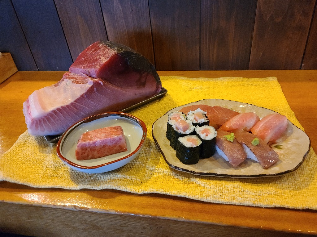 本巣市居酒屋本日紹介はマグロ、三角バラの握りです、本マグロの油の旨さと酢飯、三角バラ炙り酢飯との相性がたまらない面々で美味しくオススメです、グループの方、1人飲みの方にも是非味わって頂きたい一品です。