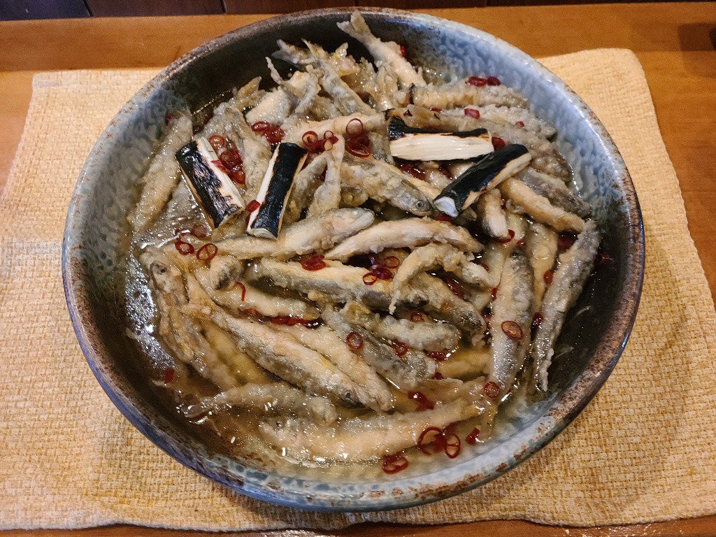 本巣市居酒屋本日紹介は今日仕込みのおばんざい、稚鮎南蛮漬けです、久しぶりに稚鮎の入荷、おばんざいにしました、甘酢でさっぱりお酒の当てに美味しくオススメです、グループの方、1人飲みの方にも是非味わって頂きたい一品です。