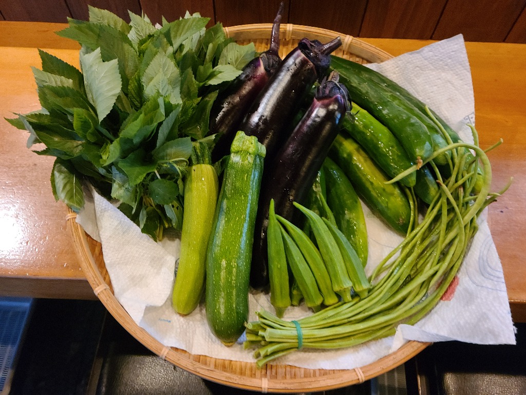 本巣市居酒屋本日紹介は朝どり無農薬野菜です、なす、きゅうり、オクラ、モロヘイヤ、ズッキーニ、十六豆です、どれも新鮮美味しくオススメです、和え物、炒め物、焼き物などにします、グループの方、1人飲みの方にも是非味わって頂きたい面々です。