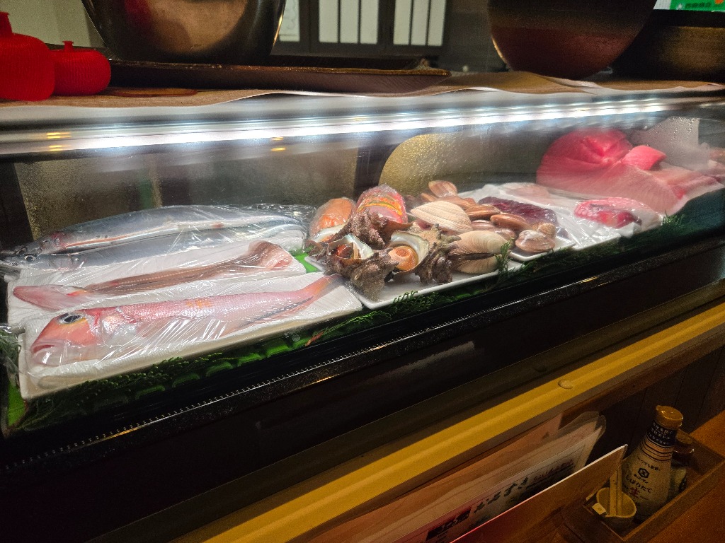 本巣市居酒屋本日のネタケースです、お刺身は本マグロ、真鯛、シマアジ、ヒラメ、サーモン、真だこ、クジラです、焼き物はサザエ、おおアサリ、甘鯛、さんまです、天ぷらに穴子、蛤酒蒸し、どれも新鮮で美味しくオススメです、グループの方、1人飲みの方にも味わって頂きたい面々です。
