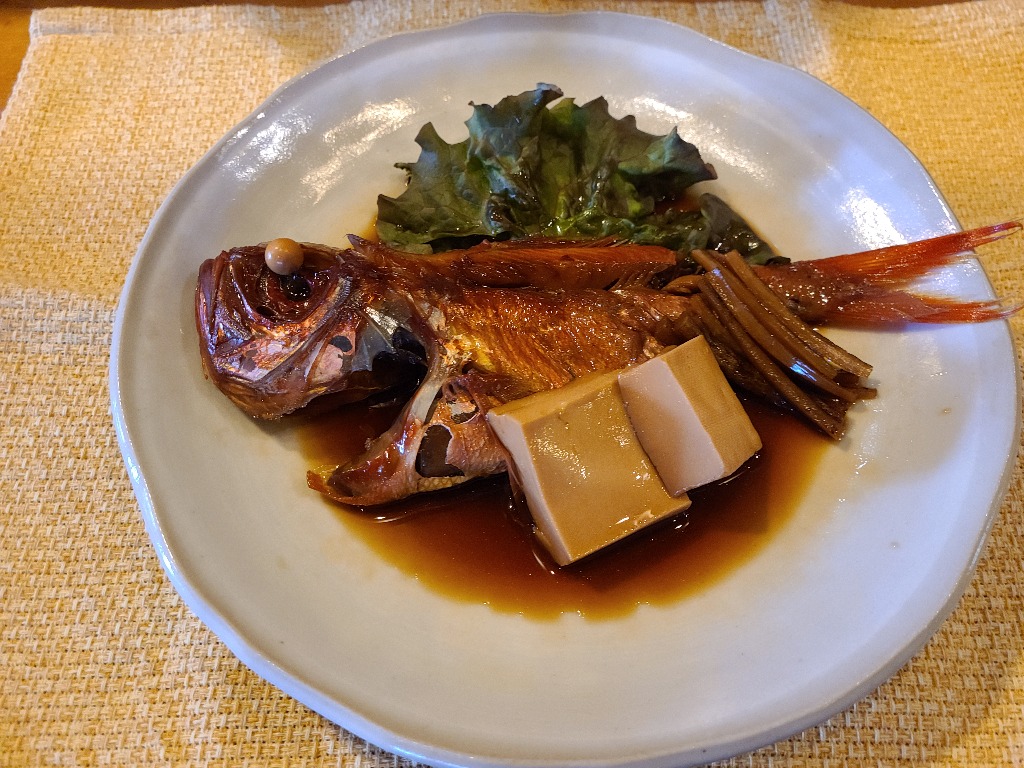 本巣市居酒屋本日紹介は金目鯛煮付けです、甘辛く味付けした金目鯛にゴボウ、豆腐を添えました、お酒のお供、ご飯のお供に美味しくオススメです、グループの方、1人飲みの方にも是非味わって頂きたい一品です。