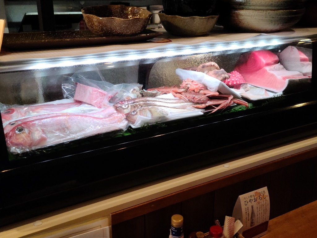 本巣市居酒屋本日仕入れの魚たちです、本マグロを始めお刺身各種、、松茸、セイコガニ、サザエ特大ハタハタ、甘鯛、金目鯛です、どれも新鮮美味しくオススメです、グループの方、1人飲みの方にも是非味わって頂きたい一品です。