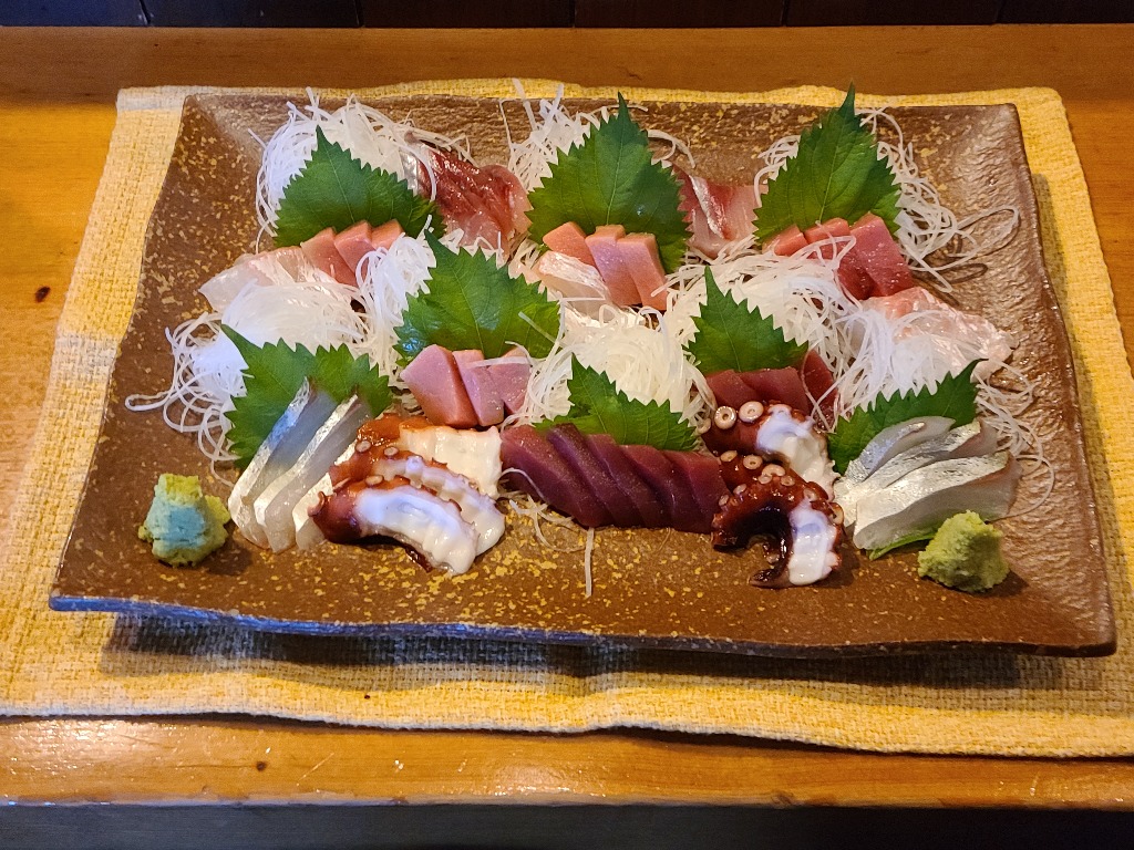 本巣市居酒屋本日の予約のお造りです、五人前の刺身盛り合わせ、本マグロ、ぶり、真鯛、シマアジ、真だこです、どれも新鮮で美味しくオススメです、グループの方には予約がオススメ、1人飲みの方にも刺身盛り合わせ、単品も用意させていただきます、いちどお試し下さい。
