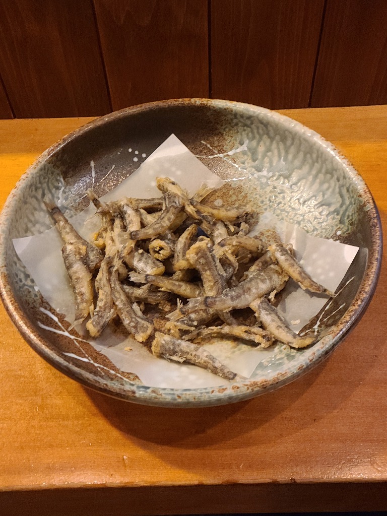 本巣市居酒屋本日紹介はおばんざいのメヒカリ唐揚げです、頭、内臓を取り除き塩調味料で味付け片栗粉をまぶし揚げました、身も柔らかくお酒のお供に美味しくオススメです、グループの方、1人飲みの方にも是非お試し頂きたい一品です。