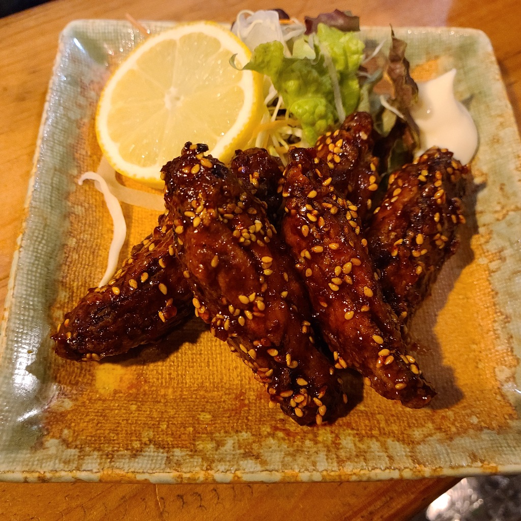 本巣市居酒屋本日紹介は一品料理の手羽中旨辛揚げです、塩麹、合わせ調味料に漬け込みました、片栗粉をまぶして揚げ旨辛だれを絡めた一品で美味しくオススメです、グループの方、1人飲みの方にもお酒🍶のお供に是非お試し頂きたい商品です。