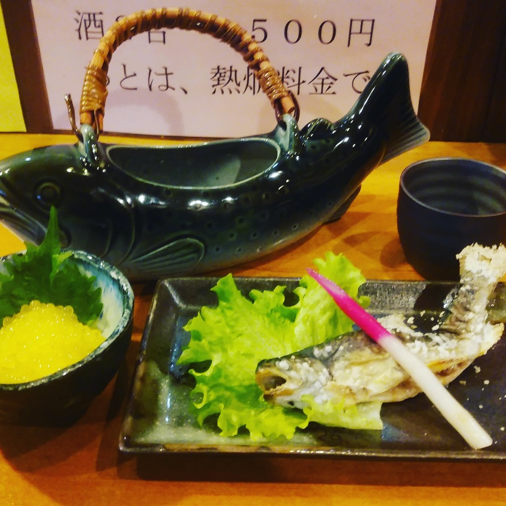 本巣市居酒屋本日紹介は岩魚骨酒セットです、岩魚一夜干しをきつめに焼き、熱燗を注ぎ込みます、あと岩魚塩焼き、岩魚のイクラが付きます、岩魚づくしで美味しくオススメとなっています、グループの方、1人飲みの方にも是非お試し頂きたい一品です。