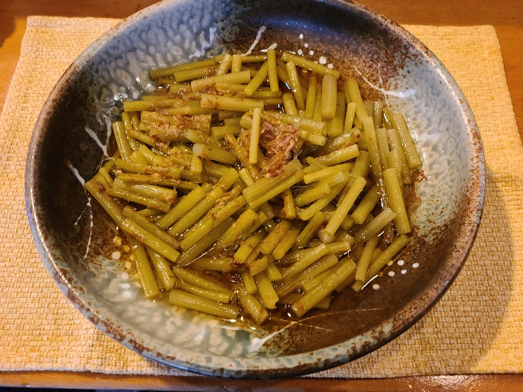 本巣市居酒屋本日は自家栽培の山吹おかか煮です、あくを抜いて、鰹出し、合わせ調味料で味付けしました、その他おばんざいの仲間は、サザエ煮付け、ひざ軟骨旨辛揚げ、じゃがいもの煮付け、きゅうり旨辛漬け、なす揚げ浸しです、お酒🍶のお供美味しくオススメです、グループの方、1人飲みの方にもお試し頂けると幸いです。