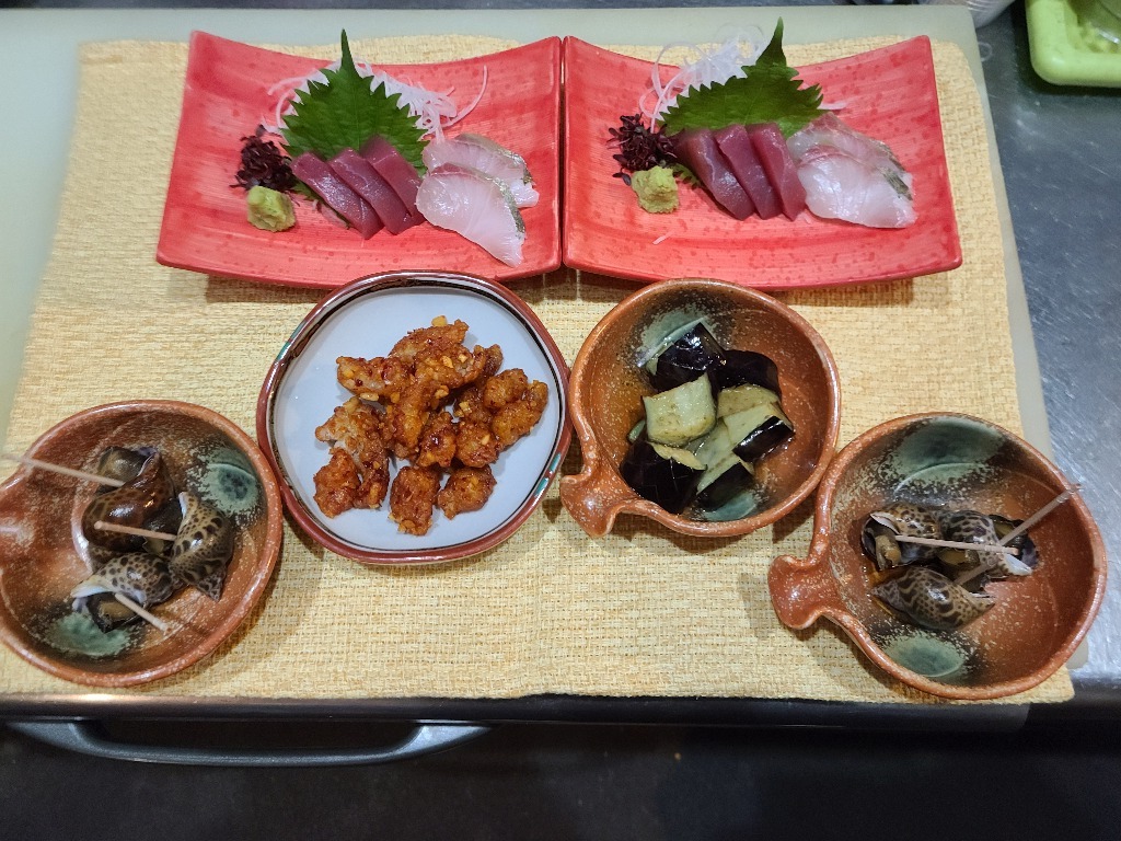 本巣市居酒屋本日のちょい呑みセット二人前です、ドリンク+お刺身、おばんざい二品、なす揚げ浸し、ひざ軟骨旨辛揚げ、バイガイ煮付けで、一人前1.380円、すぐ出るおばんざいはオススメで美味しく頂けます、1人飲みの方、グループの方も是非お試し下さい。