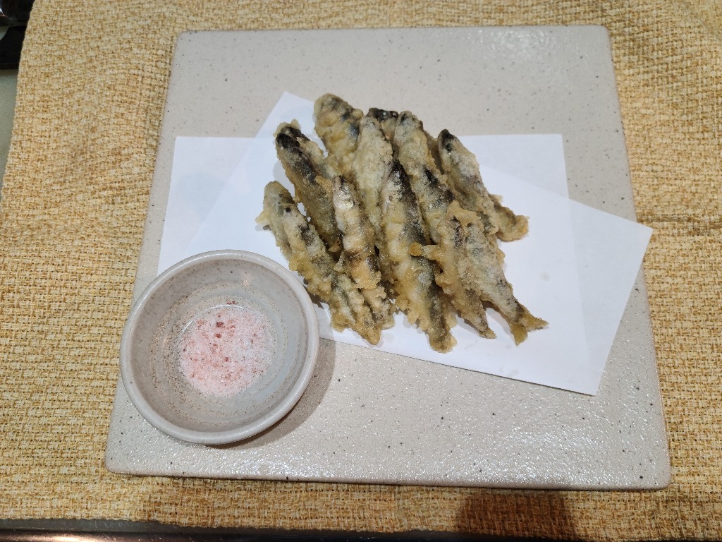 本巣市居酒屋本日紹介は稚鮎天ぷらです、天然稚鮎を天ぷらにし、岩塩で召し上がって頂きます、柔らかくふっくらで美味しくオススメです、グループの方、1人飲みの方にもお酒🍶のお供に是非試して頂きたい一品です。