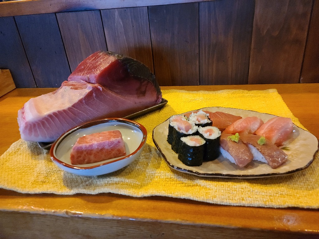本巣市居酒屋本日紹介は本マグロ、三角バラの一品です、本マグロは刺身、握り、鉄火巻き、三角バラは炙りずしに、本マグロ独特の甘味のある油、それに負けない位の牛三角バラで美味しくオススメです、グループの方、1人飲みの方にも是非いちど味わって頂きたい一品です。