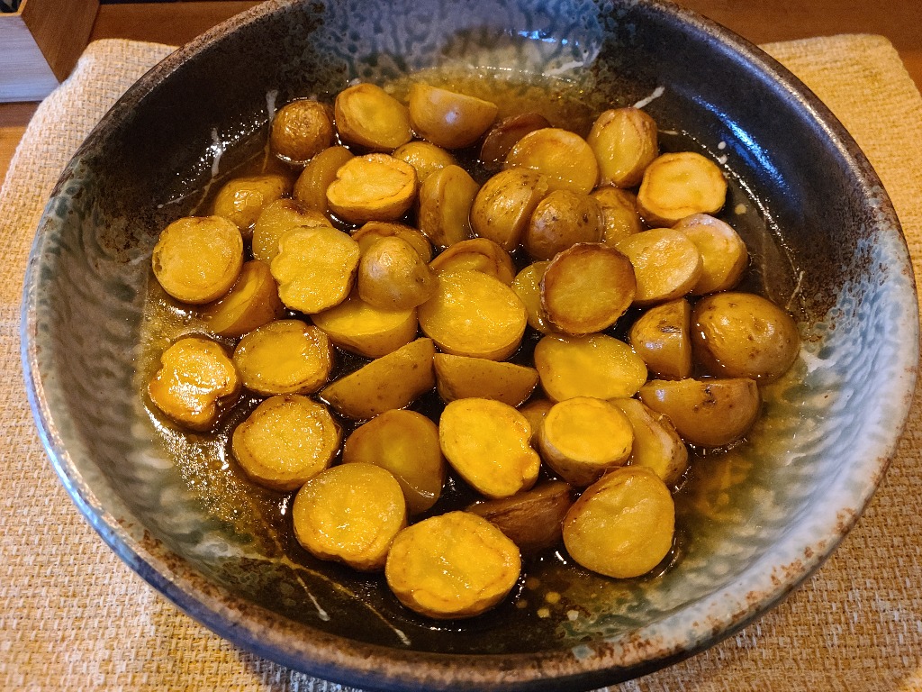 本巣市居酒屋本日のおばんざいの一品、じゃがいもの揚げ煮自家栽培の小芋を調理しました、その他おばんざいの仲間たちは、サザエの煮付け、バイ貝の煮付け、筍のおかか煮、ひざ軟骨旨辛揚げ、なす揚げ浸しが有ります、一品380円と手頃な価格で美味しくオススメです、グループの方、1人飲みの方にもお酒🍶のお供にお試し頂けると幸いです。