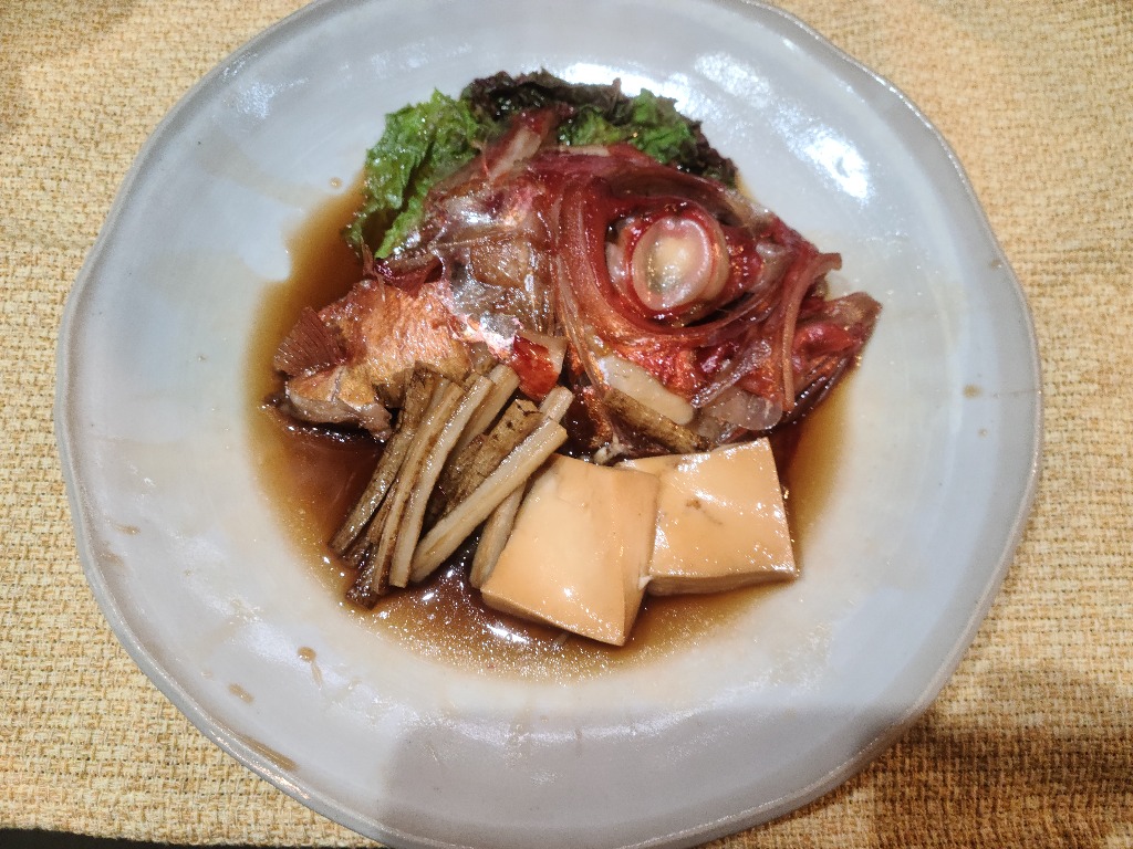 本巣市居酒屋本日紹介は金目鯛兜煮です、ほほ肉目玉、カマと色々味わえる一品で美味しくオススメです、グループの方、1人飲みの方のお酒🍶のお供に最高です、いちど味わって見て下さい。