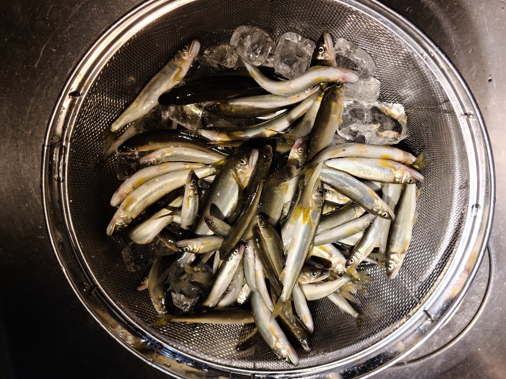 本巣市居酒屋本日紹介は今朝の釣果です、今からが旬天然稚鮎です、南蛮漬け、天ぷらに最高です、骨も柔らかく鮎の香りも良くオススメで美味しく頂けます、グループの方、1人飲みの方旬の味を楽しんで見て下さい。