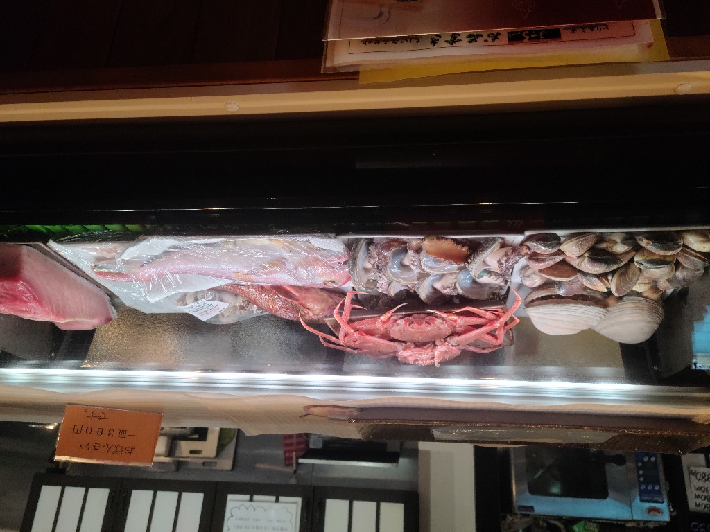 本巣市居酒屋本日のネタケースです、お刺身は本マグロ、ヒラメ、真鯛、シマアジ、サーモンです、セイコガニ、甘鯛、カサゴ、大アサリ、蛤、サザエ、アワビです、特にアワビは大特価一枚580円とお手ごろで美味しくオススメです、グループの方、1人飲みの方にもお酒🍶のお供にお試し下さい。