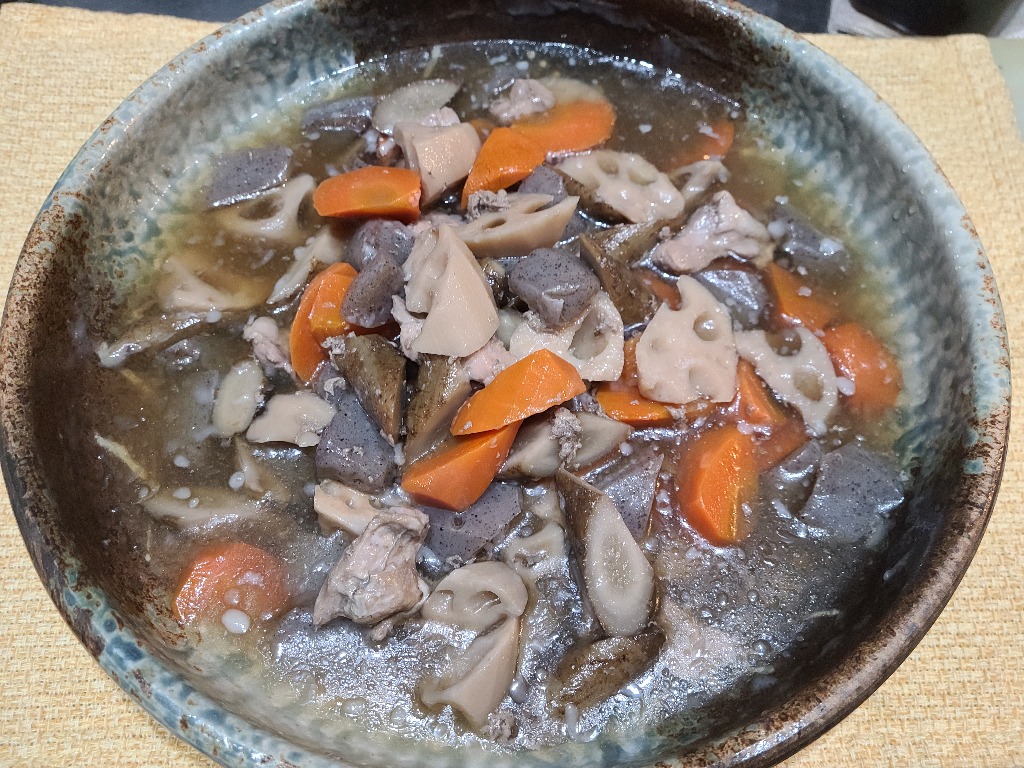 本巣市居酒屋本日のおばんざいの一品筑前煮です、価格は一品380円とオススメで美味しく頂けます、その他仲間になす🍆揚げ浸し、サザエ煮付け、つくし卵とじ、鶏ひざ軟骨旨辛揚げがあります、グループの方、1人飲みの方、お酒🍶のお供に是非いちど味わって見て下さい。