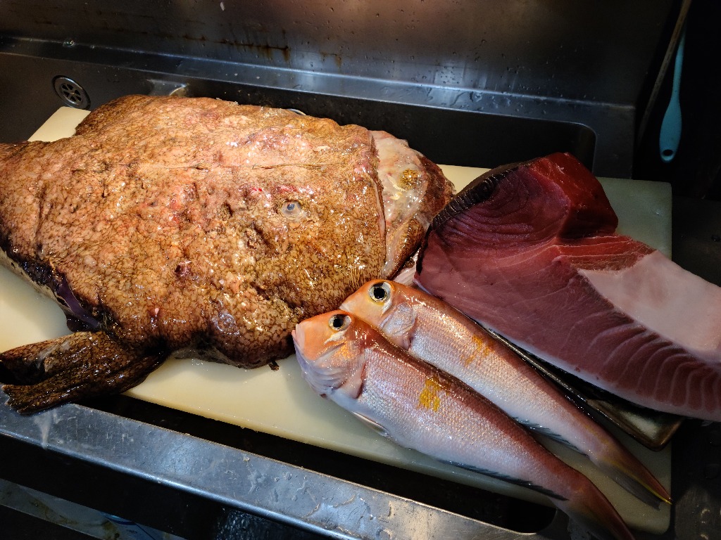 本巣市居酒屋本日入荷の魚たちです、本マグロ、甘鯛、アンコウです、甘鯛松笠焼きに、アンコウは鍋、唐揚げにオススメで美味しく頂けます、アンコウはオススメ品で価格鍋1030円、唐揚げ880円です、グループの方、1人飲みの方にもお手ごろです、いちど味わって見て下さい。