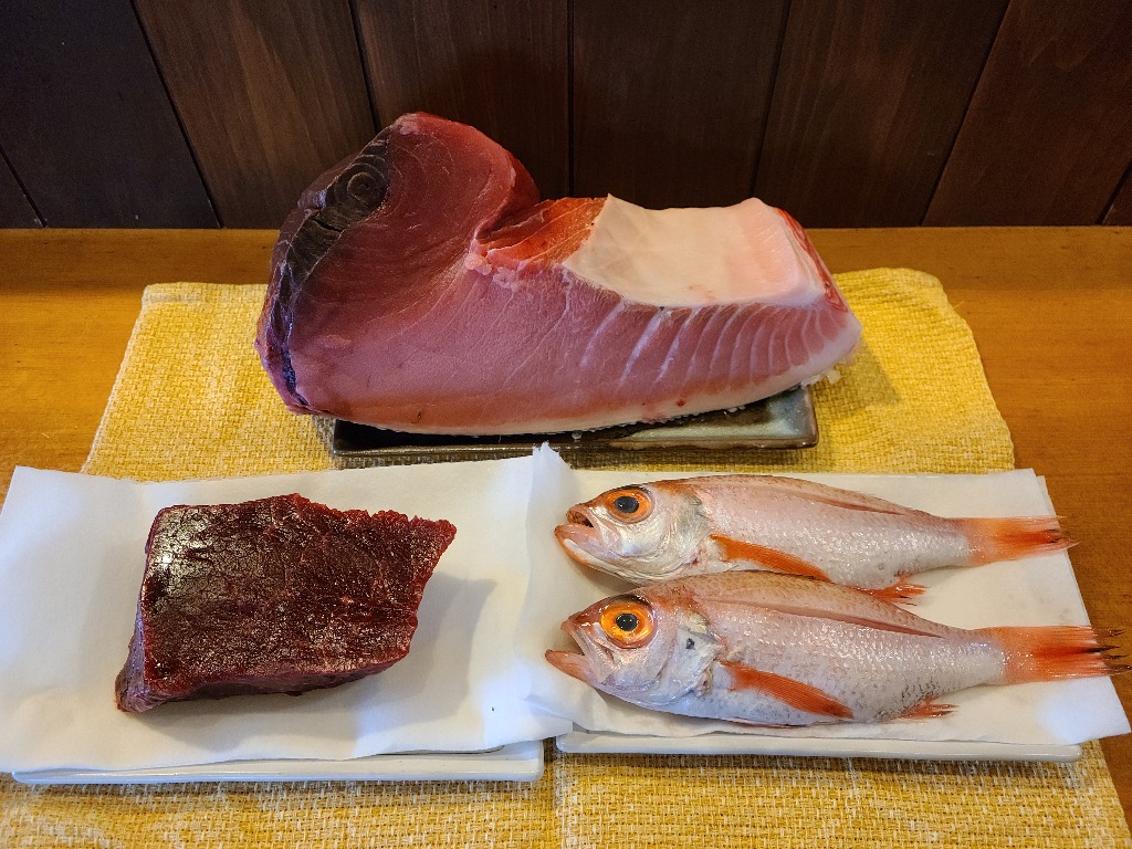 本巣市居酒屋本日入荷の魚たちです、本マグロ、ノドグロ、クジラです、ノドグロは塩焼きが美味しく、マグロ🐟️クジラはお刺身がオススメです、グループの方、1人飲みの方にもお酒のお供にいかがでしょうか、いちどお試し下さい。
