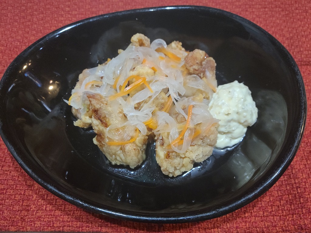 本巣市居酒屋今回紹介は定番メニューの一品です、鶏南蛮、鶏の唐揚げに甘酢で煮込んだ野菜をかけタルタルソースを添えた一品です、甘酢とタルタルソースが絶妙にマッチし美味しくオススメとなっています、グループの方、1人飲みの方にも楽しんでいただける一品です、いちどお試し下さい。