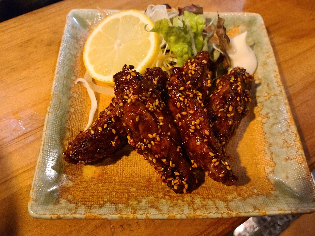本巣市居酒屋今回紹介は以前紹介した手羽中旨辛揚げです、お酒のつまみに美味しいとリピートされる方が多く見えます、手羽中の唐揚げにコチュジャンベースの旨辛だれをまとわせたオススメの一品です、1人飲みのお客様にも5本で480円とお手ごろになっております、いちどお試し下さい。