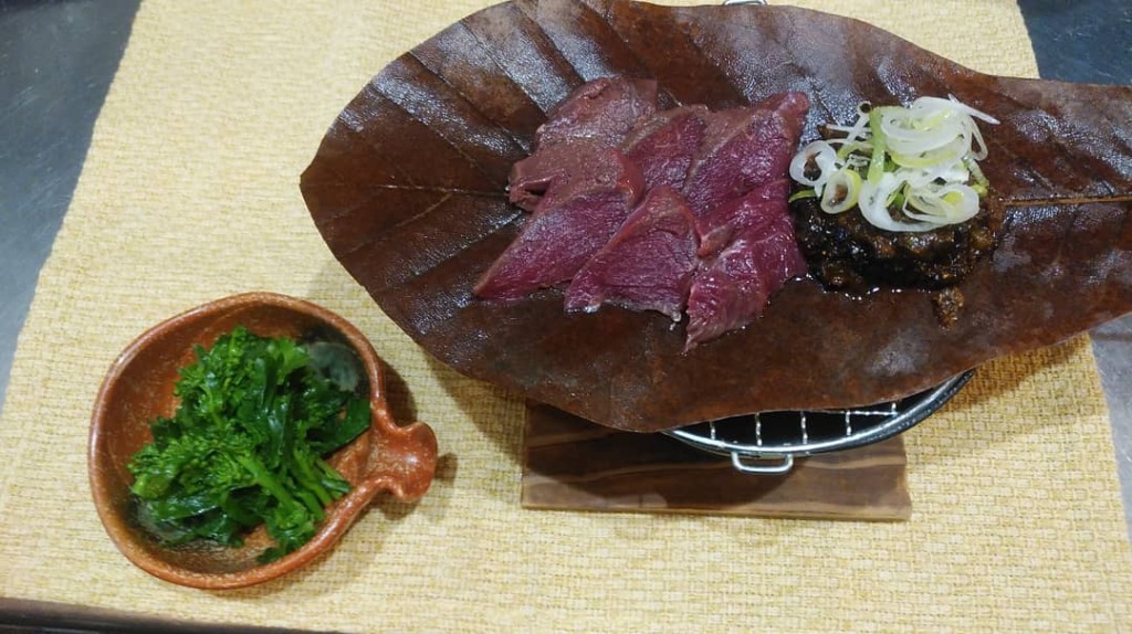 本巣市居酒屋今回紹介するのは鹿肉、オススメは鹿肉とふき味噌の朴焼きです、お酒のお供に最高です、グループのお客様、1人飲みのお客様どちらにも美味しく頂けると思います、是非お試し下さい。