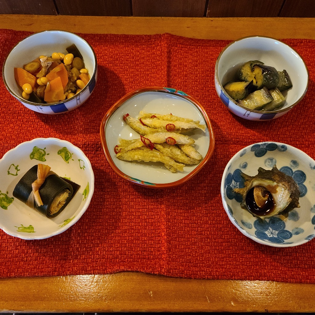 本巣市居酒屋今回紹介は本日のおばんざいです、サザエの煮付け、子持ち鮎の昆布巻き、ワカサギ南蛮漬け、五目豆、なす揚げ浸しです、一品380円となりオススメです、ちょい呑みセット1380円生中、ハイボール、焼酎、サワーの何れか+おばんざい二品+お刺身が付きます、又1人飲みの方にも美味しくちょうど良いと言われます、是非一度お試し下さい。
