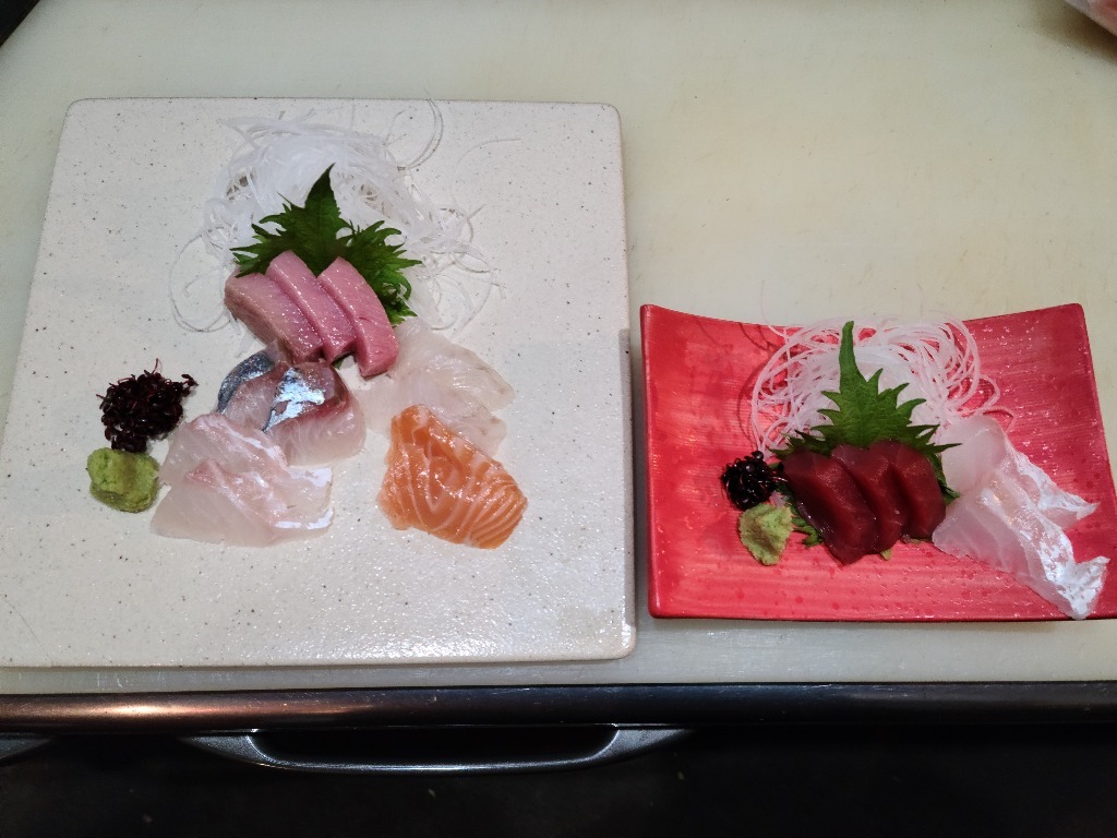 本巣市居酒屋今回は刺身盛り合わせ、ちょい呑みセットのお刺身です、刺身盛り合わせは本マグロトロ、タイ、サーモン、ヒラメ、シマアジです、価格は1.280円です、新鮮で美味しく頂けます、ちょい呑みセットは本マグロ赤身、タイです、生ビール、ハイボール等と、おばんざい二品が付き1.380円で1人飲みのお客様にもオススメです、是非一度お試し下さい。