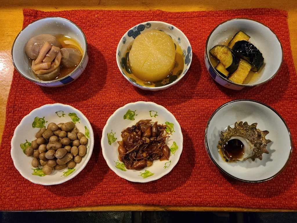 本巣市居酒屋ちょっと飲みたい、1人飲みしたい時、当店おばんざいがオススメです、日により内容は変わりますが本日の料理は、なすあげ浸し、むかご(長芋の子)、ふろふき大根、サザエの煮付け、里芋とイカの煮物、ホタルイカの煮付けです、お酒のお供に美味しく頂けます、一品380円にて提供させて頂きます是非一度お試し下さい。